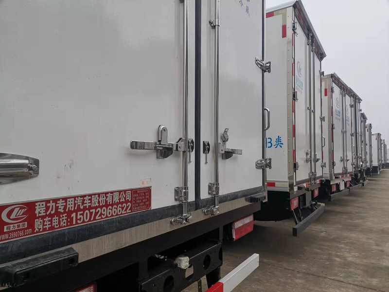 程力冷藏車廂體采用真空吸附、液壓吸附一體成型生產線制造,三明治復合粘接,保溫性能達到國家A級標準。內外壁選用國內優質玻璃鋼,中間保溫層聚氨脂膠復合,廂板厚度8CM,地板采用鋁花紋防滑板,門邊條采用迷宮式橡膠密封條。廂體周邊鋁合金型材包邊,不銹鋼包角,不銹鋼門鎖,不銹鋼門框及合頁,廂體內節能LED照明燈,4.2米以上箱長標配單側門。箱體內可以安裝肉鉤導軌。