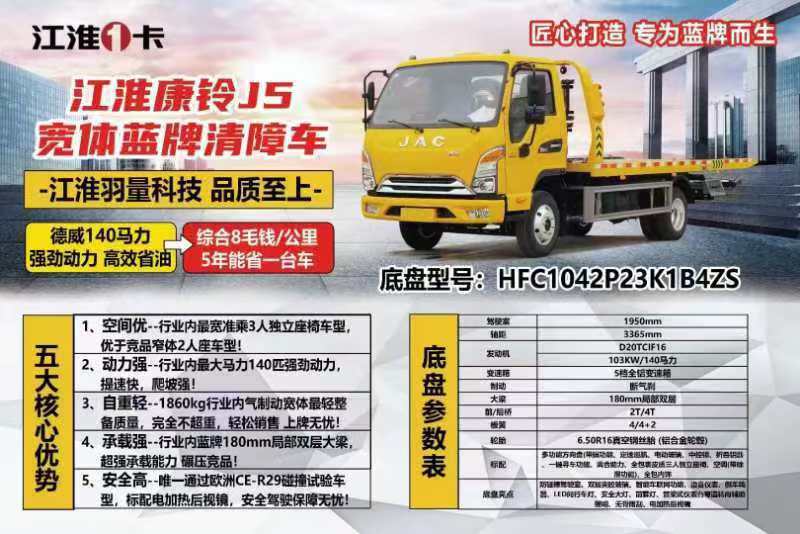 江淮J5清障車,2噸上裝,4噸卷揚(yáng),20米鋼絲繩,有三種板面可選,一體板3.8+1.3=5.1米左右,寬2.3米,雙側(cè)聯(lián)動操作,配警燈喊話器一5套.輔助小車一套,四根捆綁帶,底盤合格證,整車合格證,